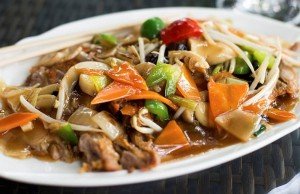 Chop suey is a dish in American Chinese cuisine and other forms of overseas Chinese cuisine, consisting of meat and eggs, cooked quickly with vegetables such as bean sprouts, cabbage, and celery and bound in a starch-thickened sauce.
