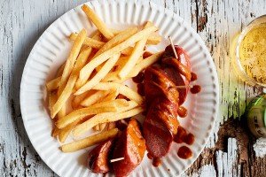 Currywurst is a fast food dish of German origin consisting of steamed, and fried pork sausage typically cut into bite-sized chunks and seasoned with curry ketchup, a sauce based on spiced ketchup or tomato paste topped with curry powder, or a ready-made k