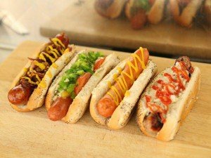 Whole cured, cooked sausage that is skinless or stuffed in a casing, that may be known as a frankfurter, frank, furter, wiener, red hot, vienna, bologna, garlic bologna, or knockwurst, and that may be served in a bun or roll
