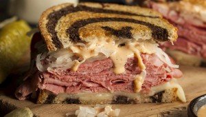 Reuben Sandwich is composed of corned beef, swiss chees, sauerkraut and russian dressing, grilled between slices of rye bread. It is associated with kosher-style delicatessens as it combines meat and cheese.